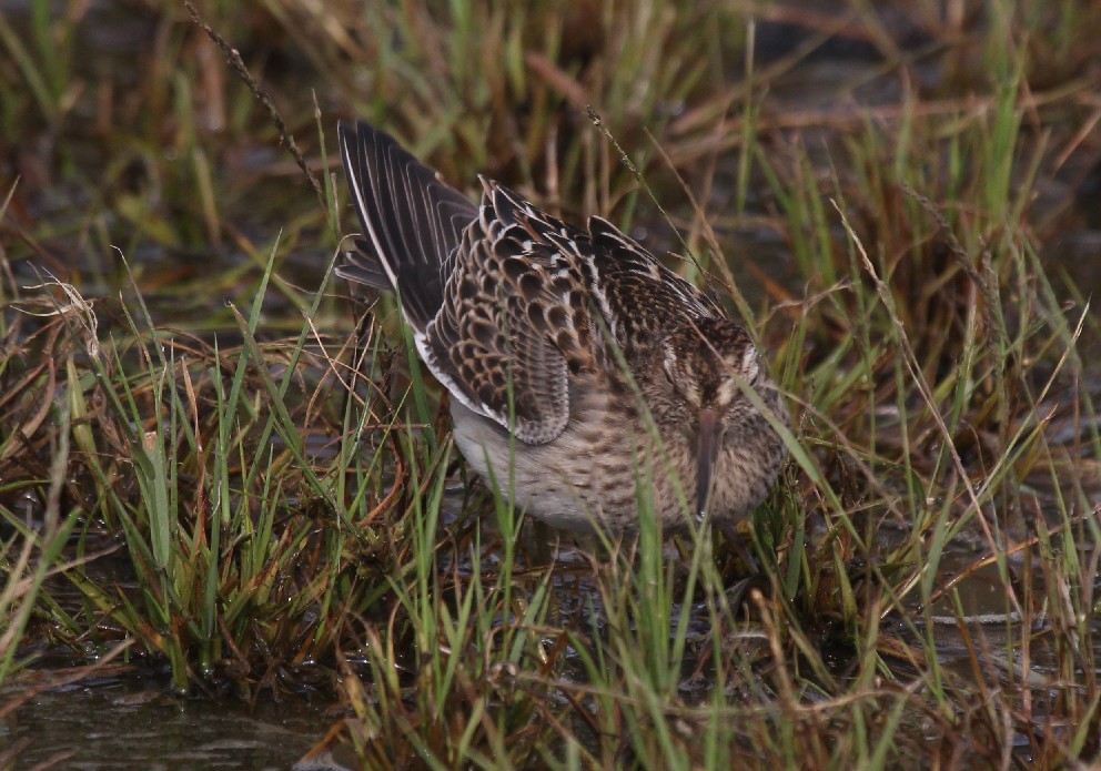 I checked the small marsh at the south side of the parking area, but no Avocet. While I was standing there hoping to see a flash of white creeping through the marsh grass, a hen Gadwall flew over, circled the area and landed in the marsh-