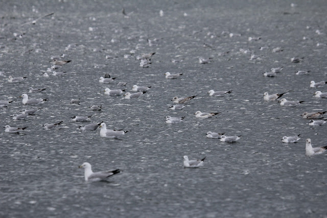 There was a small cluster of Herring and Ring-billed Gulls standing on the jetty at Southport Beach. Two small flocks of Bonaparte's Gulls tried to land on the jetty, circled once and then flew off to the east.